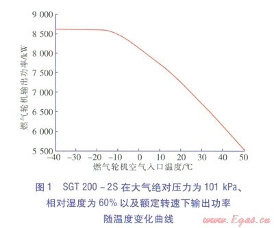 溫度升高、濕度增大固然會降低燃氣輪機的輸出功率,但是根據(jù)SGT200-2S燃氣輪機性能曲線,其設(shè)計功率能夠滿足當?shù)馗鱾€溫度下制冷劑壓縮機的功耗要求。SGT200-2S在大氣絕對壓力為l01kPa、相對濕度為60%的設(shè)定狀況以及額定轉(zhuǎn)速下輸出功率隨溫度的變化曲線見圖l。從圖1中可以看出,即使在40℃下理論上燃氣輪機輸出功率仍能滿足制冷劑壓縮機的功耗要求。該廠所處地區(qū)夏季平均環(huán)境溫度為32.7℃,低于40℃;該地區(qū)夏季相對濕度為80%,高于燃氣輪機設(shè)定狀況下的相對濕度,可能會造成燃氣輪機輸出功率有所降低,但影響效果應(yīng)該較小[1]。