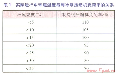 針對燃氣輪機高溫情況下易跳車的故障表現(xiàn),該工廠擬采用降低空氣入口溫度的方法解決跳車問題。其方案可行性研究報告認為,工廠夏季平均環(huán)境溫度高達30℃,相對濕度為70%~80%,溫度高、濕度大是造成燃氣輪機輸出功率不足的主要原因。燃氣輪機額定輸出功率為7.65MW,制冷劑壓縮機設(shè)計輸入功率為6.13MW,理論上燃氣輪機應(yīng)能滿足制冷劑壓縮機滿負荷下的功率要求。但在實際運行過程中,按照制冷劑壓縮機功率計算,夏季負荷率最高只能維持在80%左右,相當于燃氣輪機在該環(huán)境溫度下的輸出功率僅有4.9MW左右,遠低于燃氣輪機的額定輸出功率。該廠技術(shù)人員總結(jié)實際運行經(jīng)驗,發(fā)現(xiàn)實際運行中環(huán)境溫度與制冷劑壓縮機負荷率的關(guān)系見表l