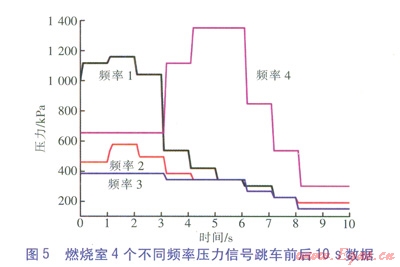 燃燒室4個不同頻率壓力信號跳車前后10s數(shù)據(jù)如圖5所示,這4個壓力信號表征燃燒室火焰振蕩特征頻段的強度。頻率l、頻率2、頻率3、頻率4代表頻率依次降低。從圖5可以看出,在2s左右,高頻段頻率1、頻率2的值突降,圖3和圖47號燃燒室的溫度也突然降低;3s左右,高頻段強度進一步降低,低頻段信號頻率4突然增強,7號燃燒室的溫度也再次下降;4s左右,這一趨勢進一步加強,7號燃燒室溫度也進一步降低;6s以后,所有頻段的信號強度都減弱,這是因為主、輔燃料閥都已經(jīng)關(guān)小,燃燒室功率下降。從以上變化趨勢可以看出,火焰高頻振動減弱、低頻振動加強代表燃燒不穩(wěn)定的增強,最后導(dǎo)致火焰被吹滅,燃燒室溫度下降。該廠現(xiàn)場操作人員也反映,燃氣輪機運行過程中除了正常的運行噪聲外,還有周期性的轟隆聲,這些外部表現(xiàn)與燃氣輪機熱聲振蕩燃燒現(xiàn)象非常相似。周期性的燃燒不穩(wěn)定,并且出現(xiàn)較大振幅的壓力波動,這種現(xiàn)象通常稱為熱聲振蕩燃燒。