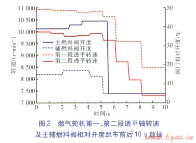 SGT200-2S燃氣輪機為雙軸燃氣輪機,燃氣輪機第一、第二段透平軸轉(zhuǎn)速及主輔燃料閥相對開度跳車前后l0s數(shù)據(jù)如圖2所示,左側(cè)縱坐標表示燃氣輪機透平轉(zhuǎn)速,右側(cè)縱坐標表示主輔燃料閥相對開度。