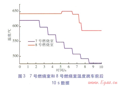 SGT-200-2S燃氣輪機有8個燃燒室,每個燃燒室都設(shè)置了測溫熱電偶,7號燃燒室和8號燃燒室跳車前后10s數(shù)據(jù)如圖3所示,其他燃燒室溫度變化情況與8號燃燒室情況類似。