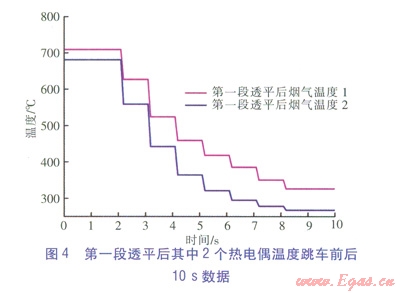 燃氣輪機第一段透平后設(shè)置了16個測溫熱電偶,其中2個熱電偶跳車前后l0s數(shù)據(jù)如圖4所示,根據(jù)熱電偶測點位置可以確定這兩個熱電偶測得的是7號燃燒室后的煙氣溫度。圖4中的數(shù)據(jù)顯示第一級透平后的溫度甚至高于圖3中燃燒室的溫度,這是因為圖3中顯示的燃燒室溫度并不是透平進口初溫(該溫度通常為ll00℃以上),而是實際燃燒室內(nèi)熱電偶布點處的溫度,由于燃燒室溫度并不是均勻的,該熱電偶所處位置溫度較低。