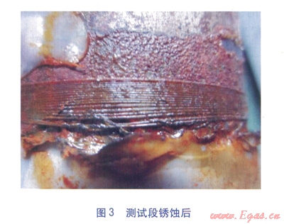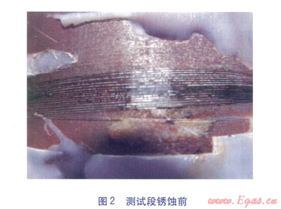 試件為一段長度為200mm的鋼管(材質為Q235),對銹蝕測試段外壁進行拋光處理,拋光后測試段外直徑為73.8mm,壁厚為3.5m。試件中光纖的布置方式見圖l。在距鋼管端面50mm處纏繞光纖層(傳感段),纏繞時使光纖帶有一定的預應力,保證光纖與鋼管表面緊密接觸,纏繞的光纖總長度在4m左右。將光纖用環(huán)氧樹脂膠固定在鋼管上,傳感段的引出端與帶保護套的傳輸光纜熔接,將熔接處進行保護處理,并在鋼管兩端的引出位置用環(huán)氧樹脂膠進行固定。光纖設置完畢后,在鋼管與PE保護管間進行發(fā)泡處理。