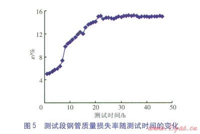 由測試結果可知,發(fā)生銹蝕前測試段外直徑D173.8mm,電化學加速銹蝕結束后測試段鋼管不包含銹蝕層的外直徑D172.8mm,代入式(2)可計算得到電化學加速銹蝕結束后測試段鋼管質量損失率e0.149,此時傳感段光纖的應變?yōu)?span lang="EN-US">2161.0×10-6。由式(7)可計算得到,由銹蝕導致的測試段體積膨脹率hl.16。設定在鋼管發(fā)生銹蝕后h保持不變,則可由布里淵分析儀讀取的傳感段光纖應變及式(7)計算得到各時刻測試段鋼管質量損失率。測試段鋼管質量損失率隨測試時間的變化見圖5。