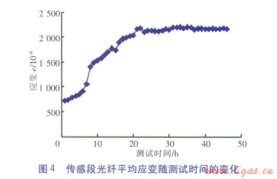 5個連續(xù)有效測點的光纖平均應變作為傳感段光纖平均應變,傳感段光纖平均應變隨測試時間的變化見圖4。
