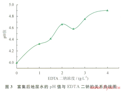 按培養(yǎng)基工的配方向地層水中加入各營(yíng)養(yǎng)物質(zhì)后,分別向各瓶地層水中添加金屬離子絡(luò)合劑EDTA二鈉,使其在地層水中的濃度分別為0、1.0gLl.5gL、2.0gL、2.5gL3.0gL、4.0gL;調(diào)節(jié)各瓶地層水的初始pH值在7.0左右,然后在35℃下富集地層水中發(fā)酵產(chǎn)氫菌4d;調(diào)節(jié)富集后地層水菌液的pH值為6.0左右,連接好產(chǎn)氣裝置,研究不同梯度EDTA二鈉對(duì)產(chǎn)氫的影響。
