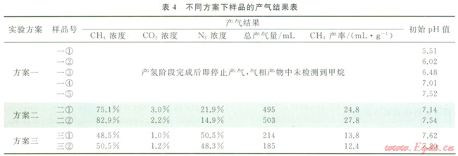 可見,方案一在產(chǎn)氫完畢后不能再繼續(xù)產(chǎn)甲烷,而方案二和方案三均可實(shí)現(xiàn)產(chǎn)氫后再連續(xù)產(chǎn)甲烷,且方案二的甲烷產(chǎn)率要遠(yuǎn)遠(yuǎn)高于方案三。方案一未產(chǎn)甲烷主要是因?yàn)樵诟患l(fā)酵產(chǎn)氫菌以及厭氧發(fā)酵產(chǎn)氫的過(guò)程中,發(fā)酵產(chǎn)氫菌生成了大量的酸性物質(zhì),使反應(yīng)液的pH值過(guò)低(3),從而抑制了產(chǎn)甲烷菌的活性,甚至使其死亡;方案二是由于在產(chǎn)氫結(jié)束后調(diào)整了反應(yīng)液的pH值至中性范圍內(nèi),使得反應(yīng)體系中的產(chǎn)甲烷菌被激活,從而大量繁殖并產(chǎn)生甲烷;方案三也產(chǎn)生了一定量甲烷,但其甲烷產(chǎn)率明顯低于方案二,是因?yàn)橄蚍磻?yīng)液中直接補(bǔ)加新鮮地層水這種處理方式使得原反應(yīng)體系中的有機(jī)物和無(wú)機(jī)物的濃度降低,產(chǎn)甲烷菌等微生物對(duì)營(yíng)養(yǎng)物質(zhì)的可獲得性降低,從而降低了產(chǎn)甲烷菌等微生物的代謝活性。