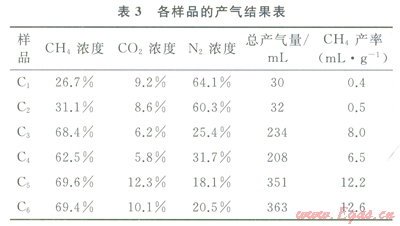 單獨(dú)發(fā)酵產(chǎn)甲烷工藝大約在第15天后才開始有甲烷產(chǎn)生,產(chǎn)氣持續(xù)時(shí)間約為30d,本實(shí)驗(yàn)于第35d測(cè)試各樣品的產(chǎn)氣結(jié)果(3)。