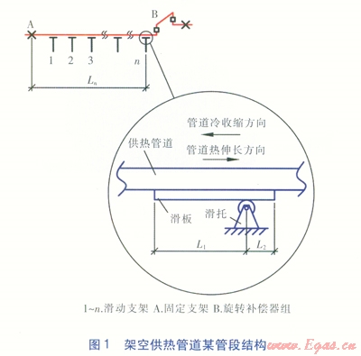 架空供熱管道滑動(dòng)支架滑板的長(zhǎng)度及安裝位置的確定,需要掌握管道在該滑動(dòng)支架處的位移量。架空供熱管道某管段結(jié)構(gòu)見(jiàn)圖1。