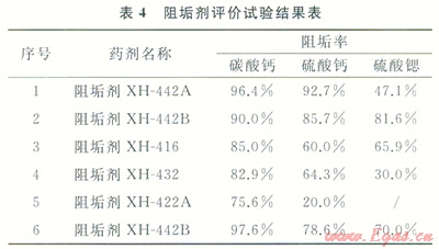 從表4可以看出,阻垢劑XH-442B在抑制硫酸鹽垢、碳酸鹽垢均能取得較好的效果。
