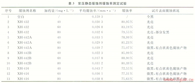 從表3可以看出,緩蝕劑XH-442B在40mg/L時(shí)具有很好的緩蝕性能,緩蝕率達(dá)86%左右。