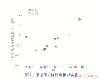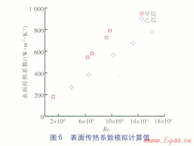 從圖5和圖6可看出,殼側制冷劑過熱態(tài)流動時摩擦壓力降梯度、表面?zhèn)鳠嵯禂?shù)均與雷諾數(shù)呈同向變化,摩擦壓力降梯度變化范圍較大,表面?zhèn)鳠嵯禂?shù)基本在200~1000W/(m2·K)。從圖7和圖8可看出,無論是甲烷還是乙烷,摩擦壓力降梯度相對誤差和表面?zhèn)鳠嵯禂?shù)相對誤差基本都控制在-25%~-15%范圍內(nèi),并且表面?zhèn)鳠嵯禂?shù)相對誤差隨著雷諾數(shù)增大而變小。由于殼側模型幾何形狀復雜,流道間隙細小,所以在不修正湍流模型的情況下數(shù)值計算相對誤差尚可。