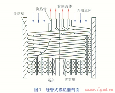 LNG繞管式換熱器用于天然氣液化工藝,這種換熱器是在芯筒與外筒之間的空間內(nèi)將換熱管按螺旋線形狀交替纏繞而制成的,相鄰兩層螺旋狀換熱管的螺旋方向相反,并且采用隔條來保持一定的間距。繞管式換熱器剖面見圖1,LNG繞管式換熱器內(nèi)部實物見圖2[1]。