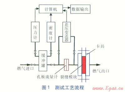 測試實驗前,對測試實驗整個系統(tǒng)進行吹掃置換,使系統(tǒng)符合燃氣運行條件。將低壓燃氣引至2m3緩沖罐中,燃氣進入此緩沖罐靜置一段時間后,其溫度、壓力及密度處于相對穩(wěn)定狀態(tài)。測試開始后,由緩沖罐所連接的壓力計與密度計測量燃氣壓力與密度,并將測量數據連續(xù)傳輸給計算機。計算機接收數據信號后,計算出未修正前的燃氣流經裂縫模塊的理論流量q0。同時燃氣經孔板流量計、卡具內裂縫模塊流至室外大氣中。在此期間,孔板流量計兩側由燃氣導壓管相連接的差壓變送器同時獲取燃氣差壓數據信號,并傳輸給計算機,由計算機編程計算出此刻流經裂縫模塊的燃氣泄漏實際流量q0。最后計算機計算輸出燃氣流量修正系數K(K=qv/q0),完成整個測試實驗。