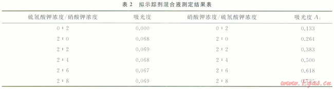 配制兩組擬示蹤劑混合樣品,第一組按照硫氰酸根的檢測方法,在455nm處測量硫氰酸根的吸光度;第二組按照硝酸根的檢測方法,在210nm處測量硝酸根的吸光度,測量結(jié)果如表2所示。