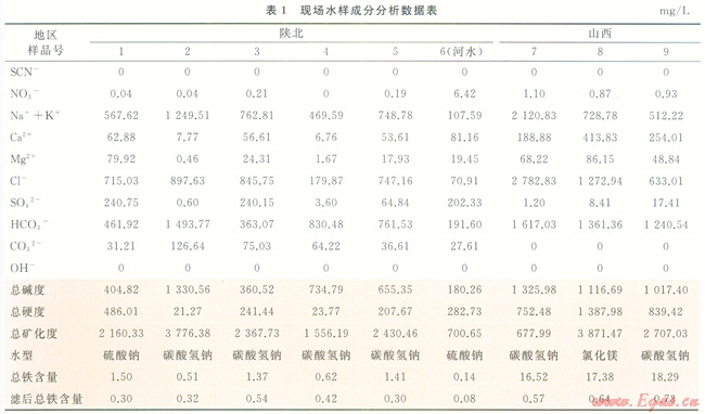 將現(xiàn)場所取回的2個(gè)區(qū)塊的8個(gè)水樣和1個(gè)壓裂液配水樣品進(jìn)行常規(guī)水質(zhì)分析[5],同時(shí)進(jìn)行了SCN-[6]和NO3-[7]的檢測。實(shí)驗(yàn)結(jié)果如表l所示。