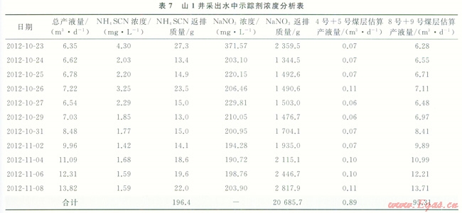 2012年5月對山1井2個(gè)層進(jìn)行了壓裂施工,8號+9號煤層注入壓裂液975.6m3,加入NaNO3 500kg,示蹤劑在單層壓裂液中的平均濃度約為510mg/L;4號+5號煤層注入壓裂液1003.5m3,NH4SCN用量500kg,示蹤劑在單層壓裂液中的平均濃度約為500mg/L。施工完成后,關(guān)井?dāng)U散壓力。油嘴控制排液,無液體返出。同年10月17日進(jìn)行排采,10月23日開始對采出液進(jìn)行采樣分析,17d內(nèi)取了11個(gè)樣,按照前面實(shí)驗(yàn)室分析方法分析SCN和NO3-(除鐵,扣減SCN吸光度的方法進(jìn)行修正),采出水中各種示蹤劑的含量如表7數(shù)據(jù)所示。