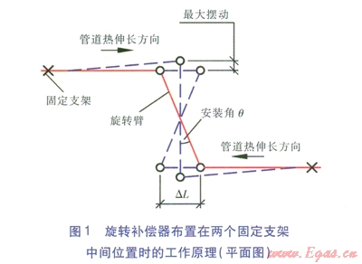 在理論上以及廠家說(shuō)明書上并沒(méi)有限制旋轉(zhuǎn)補(bǔ)償器轉(zhuǎn)角,但實(shí)際上,旋轉(zhuǎn)補(bǔ)償器的轉(zhuǎn)角(安裝角的2倍)不宜過(guò)大,應(yīng)限制在40°以內(nèi),否則會(huì)帶來(lái)兩個(gè)問(wèn)題:一是造成管道擺動(dòng)過(guò)大,二是易造成補(bǔ)償器轉(zhuǎn)角過(guò)大導(dǎo)致泄漏。旋轉(zhuǎn)補(bǔ)償器布置在兩個(gè)固定支架中間位置時(shí)的工作原理見(jiàn)圖l。為補(bǔ)償管道的熱伸長(zhǎng)量,又不使得旋轉(zhuǎn)補(bǔ)償器出現(xiàn)較大的轉(zhuǎn)角和擺動(dòng),需限定旋轉(zhuǎn)臂最小長(zhǎng)度及最佳安裝角。