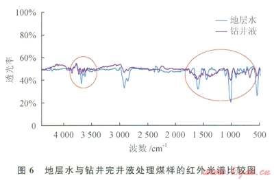 為了研究鉆井完井液作用對煤的結(jié)構(gòu)特征的影響,筆者對比了地層水與鉆井完井液浸泡樣品的紅外光譜,發(fā)現(xiàn)在3700~3500cm-1、1900~1300cm-1和1300~650cm-1這3個波數(shù)區(qū)存在較大差異(圖6)。