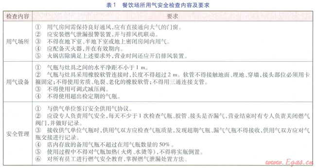自2012年11月山西壽陽(yáng)火鍋店發(fā)生燃?xì)獗ㄊ鹿屎?,武漢市立即開展對(duì)餐飲場(chǎng)所的用氣安全檢查。按武漢市出臺(tái)的《商用燃?xì)庠罹咴O(shè)施安裝及驗(yàn)收技術(shù)規(guī)程》(以下簡(jiǎn)稱《規(guī)程》)的規(guī)定,使用管道氣的餐飲場(chǎng)所在通氣前須進(jìn)行驗(yàn)收,且管道氣供氣單位須定期上門對(duì)用氣場(chǎng)所進(jìn)行安全檢查。因此,此次用氣安全檢查的重點(diǎn)是使用瓶裝氣的餐飲場(chǎng)所。根據(jù)GB 50028—2006《城鎮(zhèn)燃?xì)庠O(shè)計(jì)規(guī)范》、CJJ 94—2009《城鎮(zhèn)燃?xì)馐覂?nèi)工程施工與質(zhì)量驗(yàn)收規(guī)范》、《規(guī)程》等對(duì)瓶裝氣用氣場(chǎng)所提出的安全要求,制定了餐飲場(chǎng)所用氣安全檢查的內(nèi)容及要求(見表l)。