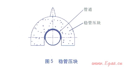 管道穿越濕陷性黃土沖溝溝底時(shí)通常采取兩種敷設(shè)形式:第一種形式是管道直接在溝底敷設(shè),在管道上采取穩(wěn)管壓塊(見(jiàn)圖5)、護(hù)岸、護(hù)底措施;第二種形式是跨越,即在放坡后的坡面,選取一個(gè)地質(zhì)條件較為穩(wěn)定的位置,設(shè)置跨越基墩,管道跨過(guò)沖溝。