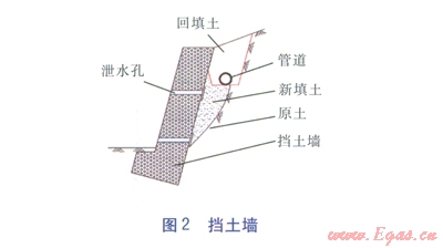 a.如果地貌允許(如荒地),首先進(jìn)行分階削方處理,使管道通過(guò)處的坡度≤30°;其次在有可能產(chǎn)生積水或高跌水的位置,考慮設(shè)置漿砌塊石截水墻(見(jiàn)圖l)、排水溝,將水疏導(dǎo)至遠(yuǎn)離管道的地方,避免出現(xiàn)漏斗、溶洞以及對(duì)管溝產(chǎn)生沖蝕。