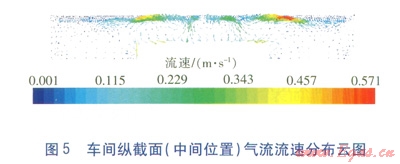 縱截面(位置)氣流流速分布云圖見圖5。由圖5可知,車室內(nèi)主要工作區(qū)氣流流速為0.500.55ms,相對(duì)于推薦值略高。