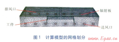 在模擬計(jì)算供暖熱負(fù)荷時(shí),僅考慮3m高度以下的主要工作區(qū)域。噴涂車間冬季室外供暖計(jì)算溫度為-9.8℃,供暖室內(nèi)設(shè)計(jì)溫度為23℃,設(shè)計(jì)供暖熱負(fù)荷為442848W。選取14塊輻射板,每塊輻射板長36.5m,熱水進(jìn)、出口溫度為93、73,總流量為19m3h。輻射板表面溫度為47℃,單位長度輻射板散熱量為867Wm,總散熱量為443100W。輻射板安裝高度為11.4m,與最長的外墻平行放置,靠墻第一排輻射板距墻0.5m3。為簡化計(jì)算,視每塊輻射板內(nèi)熱水分布均一,僅在流固交界面處有溫度變化。
