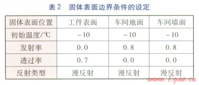 采用S2S(Surface-to-Surface)輻射換熱模型,忽略車間內(nèi)空氣對(duì)輻射板輻射能的吸收,模擬輻射板對(duì)車間內(nèi)工件、地面、墻面的熱輻射過程,以及車間內(nèi)主要的流固耦合過程。以基爾霍夫定律為基礎(chǔ),由STAR-CCM+軟件可直接計(jì)算各表面的反射率,從而進(jìn)行輻射換熱量計(jì)算。熱源(即輻射板)與各固體表面邊界條件的設(shè)定見表1、2