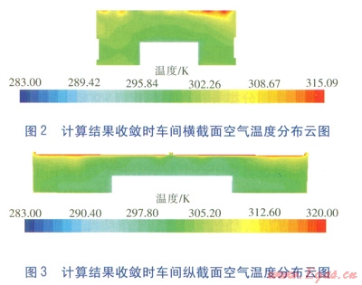 采用機(jī)械送風(fēng)(未經(jīng)處理的室外空氣)與頂面熱水輻射供暖相結(jié)合的方式,送排風(fēng)口各8個(gè),分別布置在車兩側(cè)80m長的墻上,一側(cè)為送風(fēng)口,另一側(cè)為排風(fēng)口,距離地面3.5m,尺寸均為115cm×115cm。換氣次數(shù)為5/h,機(jī)械通風(fēng)速度1ms。
