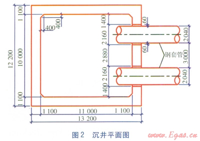 由式(6)可計(jì)算得,工作井長(zhǎng)度L11m。工作井采用沉井法施工,沉井常見(jiàn)形式有圓形沉井、矩形沉井、腰圓形沉井、多邊形沉井等。其中矩形沉井底部平面布置靈活,利用率較高,且提供的后背反力比同規(guī)模的圓形沉井大,而且矩形沉井制作方便,施工模板可多次重復(fù)使用。由于該工程需頂進(jìn)平行的兩根鋼套管,所需后背反力較大,最終選取矩形沉井。沉井平面圖見(jiàn)圖2,圖中數(shù)值單位為mm。矩形沉井內(nèi)尺寸(長(zhǎng)×)11.0m×10.0m,沉井壁厚為1.1m,下部底板附近的沉井壁厚增至1.2m。