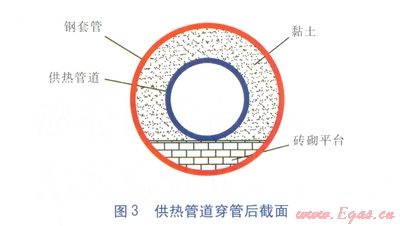 供熱管道穿管前,在鋼套管底部用磚砌成419mm高的平臺(tái),平臺(tái)表面抹灰,保證平臺(tái)表面平整。在平臺(tái)上鋪一層1mm厚的鍍鋅鋼板,在供熱管道外護(hù)層外包覆一層0.5mm厚的鍍鋅鋼板保護(hù)供熱管道。穿管結(jié)束后,供熱管道與鋼套管之通過(guò)泥漿泵填充黏土,以保護(hù)供熱管道。供熱管道穿管后截面見(jiàn)圖3