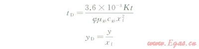 式中K為滲透率,mD;h為地層厚度,m;j為地層孔隙度;mg為氣體黏度,mPa·s;Bg為氣體體積系數(shù);cg為氣體壓縮系數(shù),Mpa-1;Zg為氣體偏差因子;T為地層溫度,K;y為空間坐標,m;yf為動邊界空間位置,m;xf為裂縫半長,m;qsc為氣井產(chǎn)量,m3/d;qref為參考產(chǎn)量,m3/d;Gp為累積產(chǎn)量,m3;p為地層壓力,MPa;t為生產(chǎn)時間,h;下標sc為標準狀態(tài),psc=0.1MPa,Tsc=293.15K;下標i為地層原始狀態(tài);下標D為無量綱量。