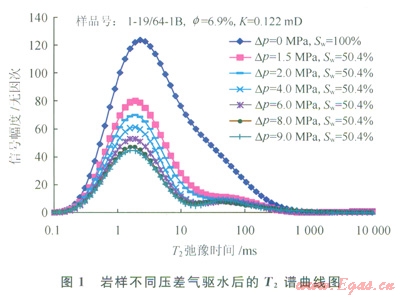 經(jīng)過成藏作用后,巖石孔隙中各類孔、喉中均有水的賦存,其賦存狀態(tài)受控于孔喉大小、形狀以及巖石表面物理性質(zhì)等[12],對于氣藏儲層來說,一般在細小孔喉處賦存的水較多。通過巖樣飽和水后進行氣驅(qū)水和核磁共振實驗,分析了登婁庫組巖石中水的賦存特征。巖樣含水飽和度為100%時測試的核磁共振T2譜曲線反映的是孔隙內(nèi)全部水體積,曲線下包面積代表了巖樣的全部孔隙體積。在不同壓差氣驅(qū)水后(氣驅(qū)水過程的驅(qū)替壓差由小到大逐步增加),巖樣達到不同含水飽和度,隨著氣驅(qū)壓差的增大,巖樣含水飽和度降低,T2譜曲線下降(圖1),相鄰T2譜曲線之間的面積代表了兩條曲線對應(yīng)驅(qū)替壓力變化所引起的可動流體變化量,因此由相鄰T2譜曲線之間的面積分布及大小可看出可動水來自哪些孔隙及總量多少[13]。