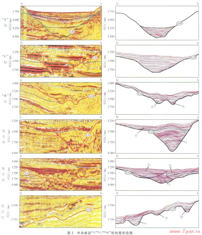 瓊東南盆地經(jīng)歷了由陸到海的地質(zhì)演化過程,期間伴隨發(fā)育有多種類型的儲(chǔ)集體:水道砂、低位扇、海底扇、生物礁、濱海砂壩、三角洲、古潛山等。其中以中新世黃流期發(fā)育于整個(gè)深水區(qū)中央坳陷帶內(nèi)的中央峽谷水道砂儲(chǔ)集體,特征最明顯。中央峽谷西起鶯歌海盆地東部陸坡,向東終止于南海西北次海盆,總長(zhǎng)度425km,寬度最大處為48.5km。其整體呈SW—NE走向,平面上呈“S”形展布,并具有“分段性”特征,由西至東可劃分為樂東段、陵水段、松南寶島段和長(zhǎng)昌段(圖1),剖面上呈對(duì)稱或不對(duì)稱的“V”“U”和“W”形態(tài)[6-7](圖2)。受多種地質(zhì)因素的共同控制,中央峽谷內(nèi)部充填結(jié)構(gòu)具有“多期次性”。充填了相互疊置的多套有利的砂泥巖儲(chǔ)蓋組合,并依靠峽谷邊界側(cè)封和巖性尖滅形成多個(gè)構(gòu)造+巖性圈閉,具有極大的勘探潛力。