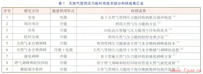 目前,管網(wǎng)壓力能利用技術(shù)研究成果隨著天然氣產(chǎn)業(yè)的蓬勃發(fā)展而取得了很大的進(jìn)展,研究領(lǐng)域涉及面較廣。國內(nèi)外在壓力能利用方面的成功案例仍局限于發(fā)電和制冰,且壓力能利用效率也較低,因此,國內(nèi)外的學(xué)者一直致力于壓力能的利用效率研究以提高壓力能利用效率。