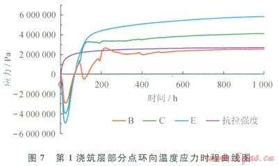 7為第l澆筑層部分點(diǎn)環(huán)向溫度應(yīng)力時(shí)程曲線。由圖7可知,在外罐施工期間,混凝土先受壓后受拉,在混凝土澆筑68h后,混凝土由受壓狀態(tài)轉(zhuǎn)變?yōu)槭芾瓲顟B(tài),在混凝土澆筑120h后,第1澆筑層底部某點(diǎn)所受拉應(yīng)力超過了混凝土的抗拉強(qiáng)度,底部混凝土開始產(chǎn)生溫度裂縫。B點(diǎn)應(yīng)力曲線存在上下波動(dòng)是由于B點(diǎn)易受上層新澆筑混凝土的影響;比較B、C、E點(diǎn)應(yīng)力時(shí)程曲線可知,混凝土離罐底越近,產(chǎn)生的溫度應(yīng)力越大。