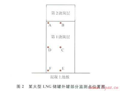 以山東某液化天然氣接收站的一個(gè)160000m3大型LNG儲(chǔ)罐混凝土外罐為例進(jìn)行數(shù)值計(jì)算,混凝土外罐內(nèi)徑為41m,外徑為41.8m,壁厚為0.8m,高為41.1m。混凝土外罐分ll層進(jìn)行澆筑,其中19層澆筑高度為4m,第l0層澆筑高度為l.5m,第ll層環(huán)梁澆筑高度為2.6m,模板采用20mm膠合板,相鄰施工層時(shí)間隔為4d。由于結(jié)構(gòu)的對(duì)稱性,取罐壁的四分之一(相鄰扶壁柱之部分)進(jìn)行有限元分析(1),外墻地板采用固定端約束,由扶壁柱對(duì)外墻的約束,在其兩側(cè)面上施加對(duì)稱彈性約束。監(jiān)測(cè)點(diǎn)分布位置如圖2所示。