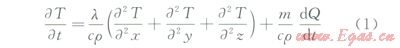 混凝土的熱傳導(dǎo)是一個(gè)瞬態(tài)過程,溫度場(chǎng)是齡期和空間函數(shù),混凝土中三維不穩(wěn)定溫度場(chǎng)的熱傳導(dǎo)微分方程為: