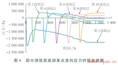 5為各澆筑層底部某點(diǎn)環(huán)向應(yīng)力時(shí)程曲線,圖6為部分澆筑層底部某點(diǎn)豎向應(yīng)力時(shí)程曲線。由圖5可知,在LNG儲(chǔ)罐外罐施工期間,溫度應(yīng)力分為壓應(yīng)力發(fā)展、壓應(yīng)力轉(zhuǎn)變?yōu)槔瓚?yīng)力及拉應(yīng)力趨于殘余應(yīng)力3個(gè)階段。比較圖5和圖6可知,混凝土外罐在溫度及重力荷載作用下,第一主應(yīng)力為環(huán)向應(yīng)力,與彈性力學(xué)理論分析的結(jié)果相符,而且現(xiàn)場(chǎng)施工經(jīng)驗(yàn)表明混凝土外罐在施工期間底部經(jīng)常產(chǎn)生豎向裂縫。由圖5知,第1澆筑層所受的溫度應(yīng)力明顯大于其他澆筑層,產(chǎn)生這種狀況的原因是第1澆筑層混凝土受到罐底的約束度相對(duì)較大;因第39澆筑層澆筑高度及約束狀況相近,所以其應(yīng)力變化曲線相似;第10澆筑層環(huán)向應(yīng)力曲線因受環(huán)梁澆筑的影響而產(chǎn)生2MPa的應(yīng)力波動(dòng)。