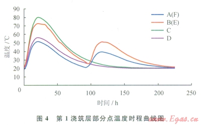1澆筑層部分點(diǎn)溫度時(shí)程曲線如圖4所示。由圖4可知,在外界恒溫條件下,混凝土內(nèi)部溫度在其澆筑約ld后迅速達(dá)到峰值,之后開始緩慢降溫,在其澆筑約10d后趨于穩(wěn)定。由圖4還可知,外罐罐壁厚度中心最高升溫約為60℃,混凝土易產(chǎn)生深層裂縫;混凝土內(nèi)部與表面溫差為25℃,混凝土表面具有開裂的危險(xiǎn);頂部}昆凝土塊內(nèi)部溫度受上層新澆筑混凝土的影響比較大。因此AB測(cè)點(diǎn)在溫度下降階段有2030℃的溫度波動(dòng),數(shù)值分析表明,新澆筑混凝土對(duì)下層混凝土的影響深度約為1.2m