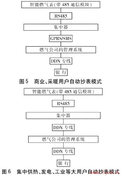 特點:商業(yè)用戶主要包括酒店、餐廳等,常年用氣,用戶分散,流量通常在500m3/h以下。采暖、制冷用戶主要是季節(jié)性用氣大戶,而且在采暖、制冷期實行不同的燃?xì)鈨r格機制,流量通常為500~5000m3/h。此類用戶的數(shù)量比居民用戶少得多,但用氣量卻遠大于居民用戶。建議采用圖5所示的自動抄表模式。