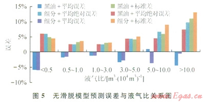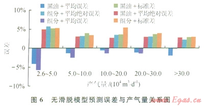 無滑脫模型各項誤差次之(4),組分模型計算誤差大于黑油模型,是由于Govier-Fogarasi用的凝析氣井液氣比為0.0514.4m3104m3,從黑油模型對所選模型(無滑脫、GrayHagedorn&Brown沒有劃分流型)計算流型看:Mukherjee&BrillOrkiszewski所有井井簡全部為段塞流,HasanKabir預(yù)測結(jié)果除5井次出現(xiàn)分散泡狀流以外,其余井全為環(huán)狀流。段塞流為一段氣一段液,而環(huán)狀流主要靠氣相中攜帶的液滴和氣相與管壁液膜的摩擦帶液。因此兩種流型的滑脫損失均較小,可以采用無滑脫模型計算壓降。從分段液氣比看,液氣比小于0.5m3104m3,誤差較大,這主要是由于氣液比極高,舉升壓降極小,13口壓降梯度平均為1.74MPa1000m,導(dǎo)致井底流壓(13口井底流壓平均13.4MPa)較小,即使計算的井底流壓誤差較小因井底流壓測壓值較小而誤差較大。隨著液氣比的增加,各項誤差逐漸增加(5)?,F(xiàn)考慮各項誤差限為5%,采用無滑脫模型的液氣比范圍為0.55m3104m3,并對該氣液比條件下的產(chǎn)氣量進(jìn)行了分段統(tǒng)計如圖6所示,隨著產(chǎn)氣量的增加,各項誤差逐漸下降。因此無滑脫模型按黑油計算適用條件為:液氣比0.55m3104m3,產(chǎn)氣量大于5×104m3d,井底流壓誤差小于5%。