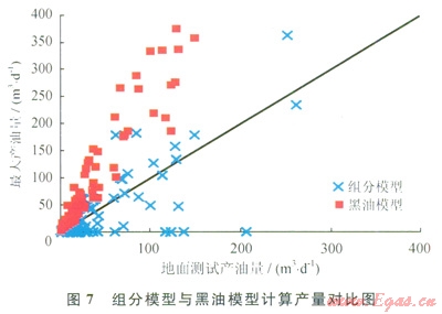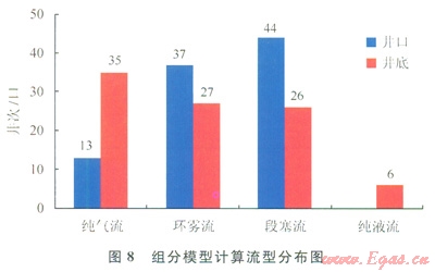 從所選的4個氣液兩相流模型(Hagedorn&BrownOrkiszewski、Mukherjee&Brill、Hasan&Kabir)看,Hagedorn&Brown模型各項誤差最小,按組分模型計算的誤差明顯小于黑油模型。為了討論組分模型對流型、凝析油流量的影響,現(xiàn)選用誤差較小且考慮流型的Mukherjee&Brill進(jìn)行統(tǒng)計分析。分別按組分模型和黑油模型計算的井筒最大產(chǎn)油量如圖7所示,組分模型計算的井筒最大產(chǎn)油量明顯較地面測試產(chǎn)油量大得多,而按黑油模型計算的產(chǎn)油量明顯偏小,說明隨井筒向上流動過程中,壓力溫度降低導(dǎo)致了凝析油的析出,與實際情況一致;井筒流量的改變使流型發(fā)生明顯變化,黑油模型計算的井筒流型全部為段塞流,組分模型計算時井底高溫高壓凝析油未析出或析出較少,以純氣流、環(huán)霧流和段塞流為主,所占井次比例依次下降,而井口主要流型未變,但各流型的井次比例呈明顯的反比關(guān)系(8),使按組分模型計算的各項誤差明顯小于黑油模型。