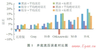 采用工程常用的無滑脫模型、HagcdornBrown[21]、Orkiszewski[22]、Gray[23]、Mukherjee&Brill[24]HasanKabir[25]對上述凝析氣井井底流壓進(jìn)行了計算,其誤差統(tǒng)計結(jié)果如表3和圖12所示。