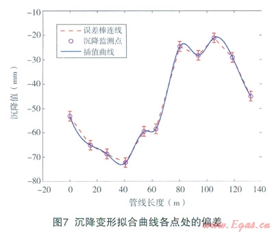 在本次試驗中,由于監(jiān)測時間較短,在整個監(jiān)測時間段內(nèi)管道沒有發(fā)生大的實際變形,所以小的變形量就導致了比較大的相對誤差。為了考察大變形下誤差對計算結(jié)果的影響,不妨把管道的沉降測量值增大10倍。以第2個月的監(jiān)測值作為算例,利崩Matlab進行30次的隨機數(shù)生成,其沉降變形擬合曲線的偏差范圍如圖7。