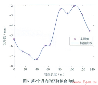 通過Matlab軟件,可容易地對沉降值進行三次樣條擬合,以第2個月內(nèi)的沉降監(jiān)測點為例,進行曲線插值擬合,結(jié)果曲線如圖6。