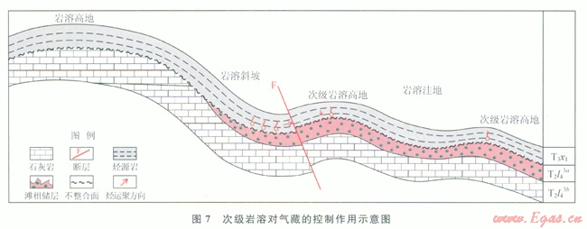 從全盆地雷口坡組巖溶格局來講,古隆起處于高部位,地層剝蝕程度大,為巖溶高地;凹陷內(nèi)地層剝蝕程度弱,保留了雷四段的區(qū)域?yàn)閹r溶洼地,其間的區(qū)域?yàn)閹r溶斜坡。巖溶對(duì)儲(chǔ)層的改造以巖溶高地最好,次為巖溶斜坡,巖溶凹陷最差,但處于巖溶凹陷的龍崗地區(qū)反而獲得了新的發(fā)現(xiàn)。