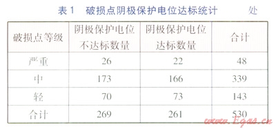 測(cè)得530處防腐層破損點(diǎn)管道電位分布情況是:261處防腐層破損點(diǎn)極化電位為-950~-850mV,達(dá)到最小保護(hù)電位要求(-850mV),破損點(diǎn)陰極保護(hù)電位達(dá)標(biāo)統(tǒng)計(jì)見(jiàn)表1。