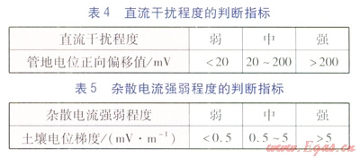 SY/T 0017—2006《埋地鋼質(zhì)管道直流排流保護(hù)技術(shù)標(biāo)準(zhǔn)》中第3.0.1條規(guī)定:“處于直流電氣化鐵路、陰極保護(hù)系統(tǒng)及其他直流干擾源附近的管道,應(yīng)進(jìn)行干擾源側(cè)和管道側(cè)兩方面的調(diào)查測(cè)試。當(dāng)管道任意點(diǎn)上的管地電位較自然電位偏移20mV或管道附近土壤電位梯度大于0.5mV/m時(shí),確認(rèn)為直流干擾。”第3.0.2條規(guī)定,管道直流干擾程度一般按管地電位較自然電位正向偏移值按表4所列指標(biāo)判定;當(dāng)管地電位較自然電位正向偏移值難以測(cè)取時(shí),可采用土壤電位梯度按表5所列指標(biāo)來(lái)判斷雜散電流的強(qiáng)弱程度。